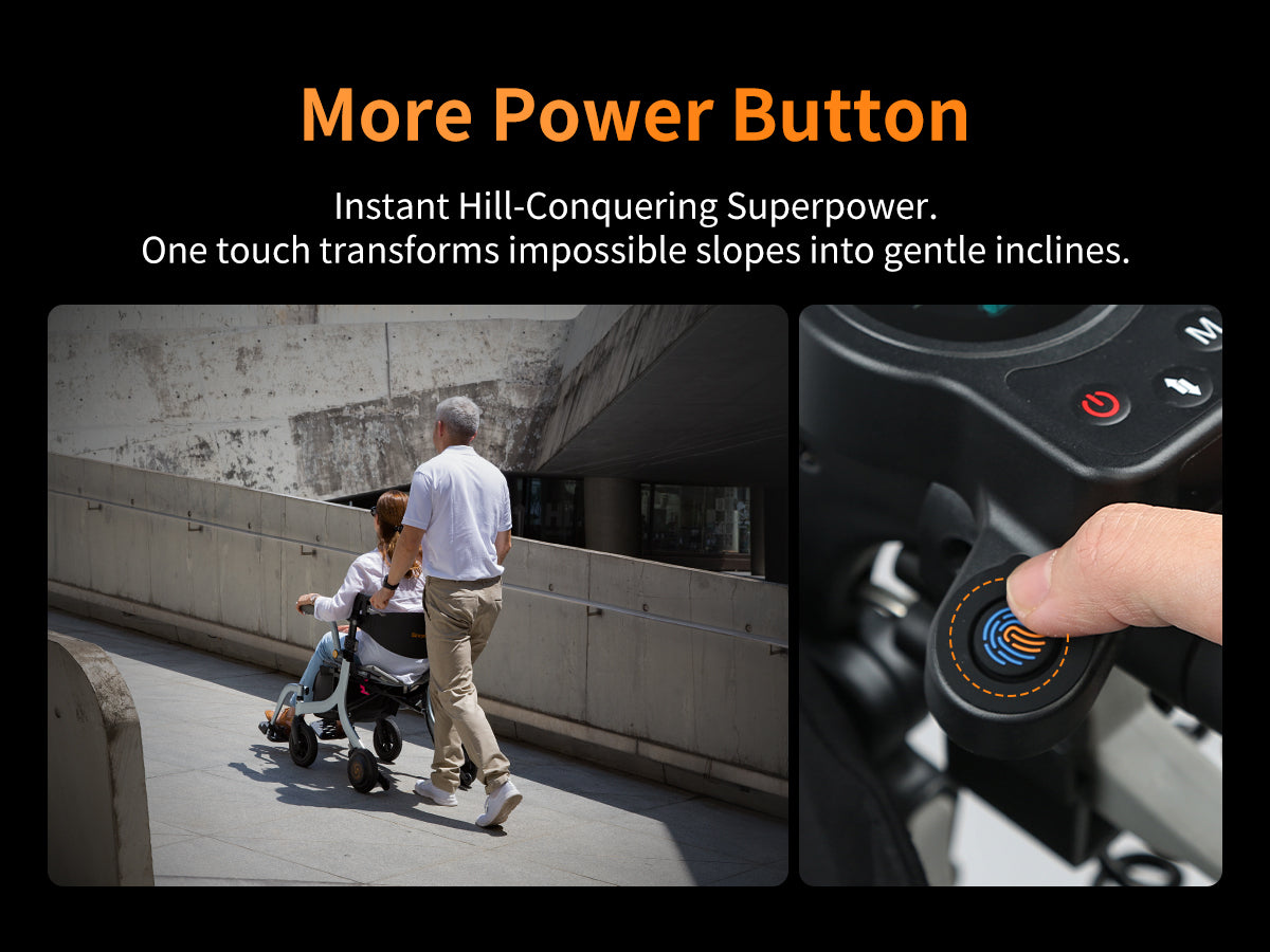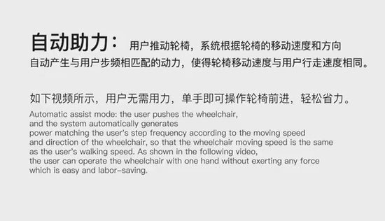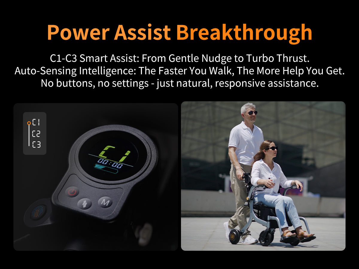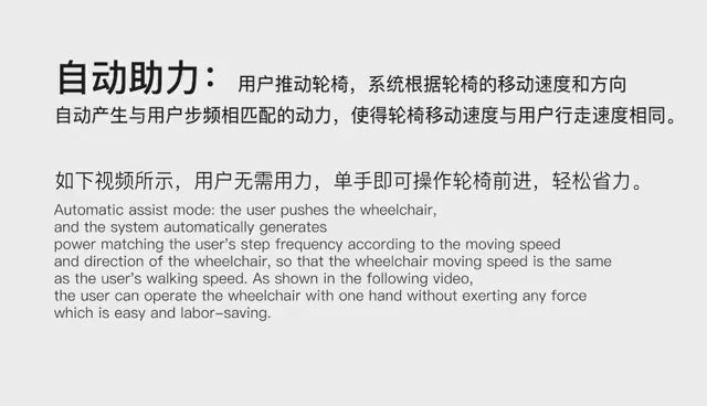 One is power assist mode for carer , carer controlled the power chair or the rollator with smart power assist, you walk faster it goes faster, follow your steps.